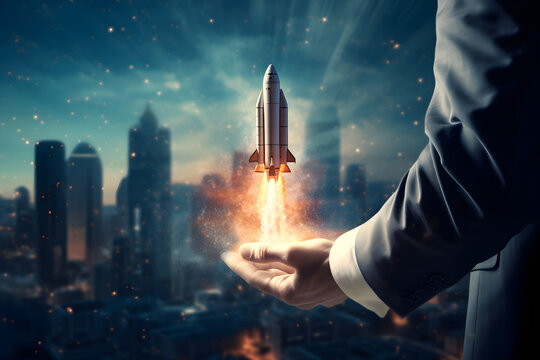 businessman propels a rocket against an urban backdrop, embodying innovation, entrepreneurship, ambition, and the quest for uncharted success in the business world