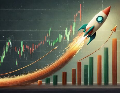 Illustration of a rocket ascending over an upward trending stock market chart, concept for strong bull market with skyrocketing prices