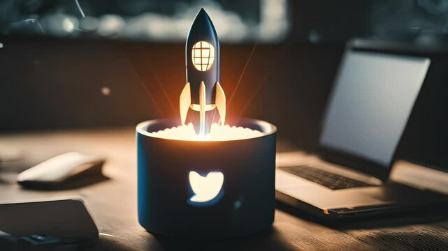 An abstract depiction of a technologyinspired background with a skyrocketing rocket launching towards a successful future for a startup.