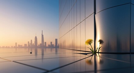 Lone dandelion thrives against a modern skyscraper at sunrise with city skyline backdrop
