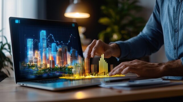 Big data analytics insights with modern urban skyscraper backdrop