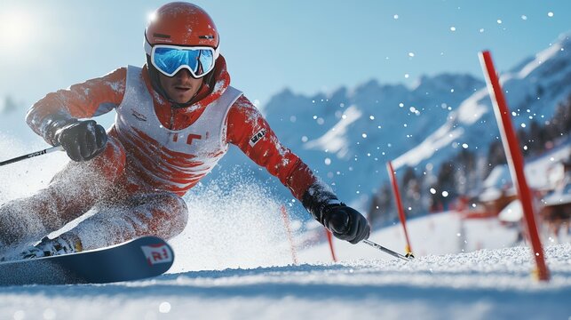 Skier racing down a giant slalom course, with gates, snow spray, and a focused expression under clear skies. 4K hyperrealistic photo.