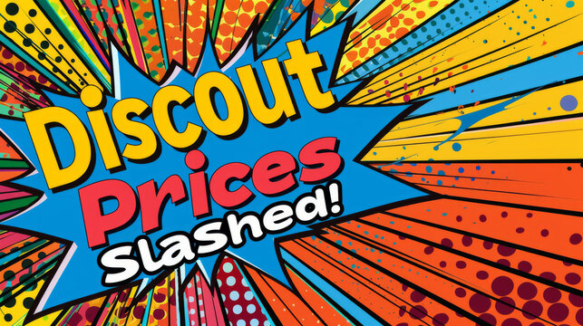 Comic-inspired advertisement showcasing slashed prices and discounts in a vivid, attention-grabbing design.