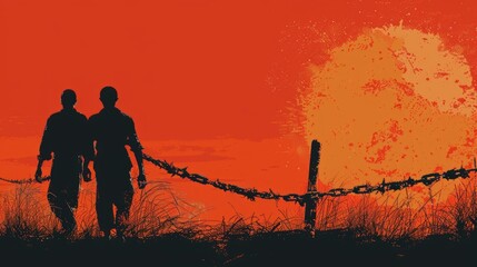 silhouettes of chained people walking along the sand against the backdrop of sunset symbolizing unity and remembrance