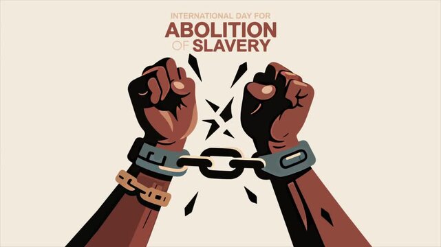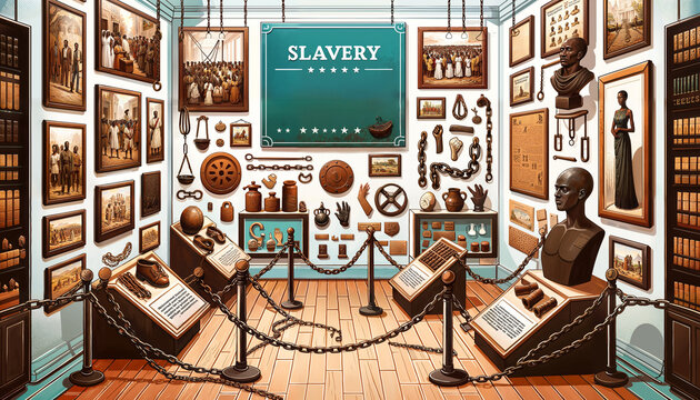Illustration of a museum exhibit showcasing the history of slavery, with artifacts, chains, and plaques, and a sign highlighting 'International Day for the Abolition of Slavery'.