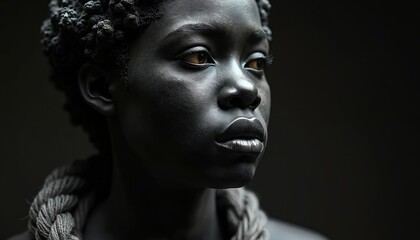 Art photo of african american woman with braided rope on neck. Dark artistic portrait embodies struggle, humanitarian themes, highlights remembrance of slavery abolition, emphasizes freedom,