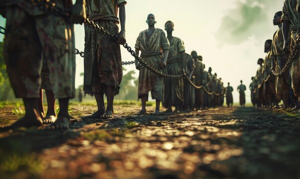african slave line up bound by steel chain. for commemorate freedom from slavery in America. Juneteenth celebrate photo concept.