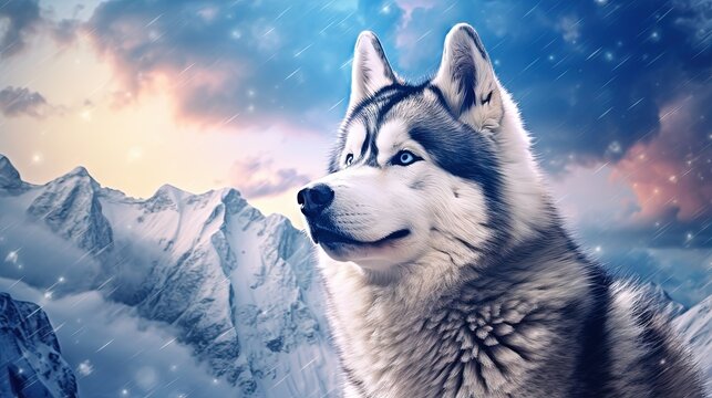 Portrait of a Siberian Husky dog outdoors. Footage. Close-up portrait of noble sled dog a Chukchi husky breed dog on winter background