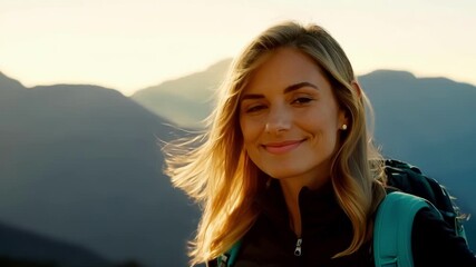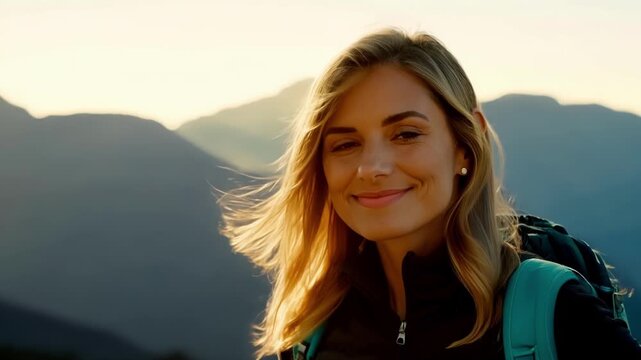 A woman in her thirties with sleek blonde hair and bold features stands confidently against a backdrop of beautiful mountains her expression exuding pride and accomplishment in