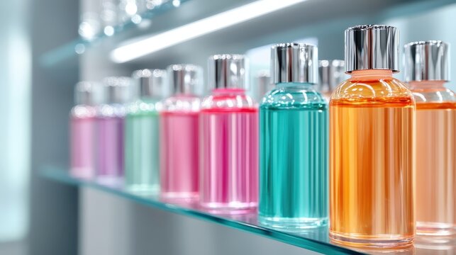 A display of colorful perfume bottles on a sleek glass shelf, showcasing elegance and luxury in fragrance choices, appealing to the senses and aesthetic desires.