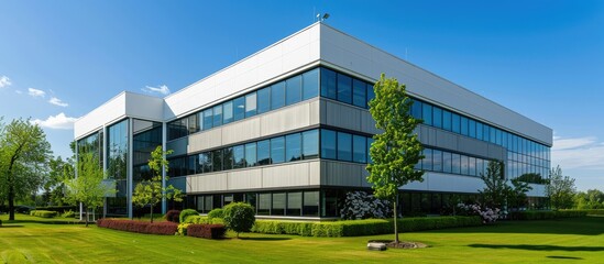 Exterior of a contemporary office building with a clean and sleek appearance featuring ample copy space image for promotional material