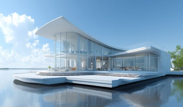 A modern floating house with extensive glass windows situated by the water, showcasing contemporary design and a sleek appearance.