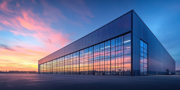 Modern Warehouse with Glass Windows at Sunset