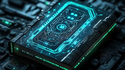 A bold sci-fi book cover with a high-tech circuit design in neon blue and green on a matte black background, featuring sharp angular typography in metallic silver,