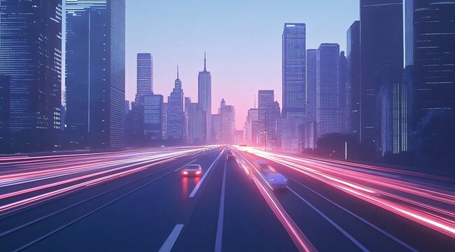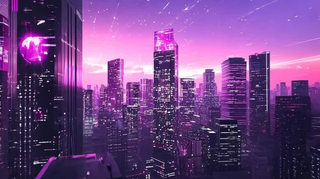 Neon Cityscape: A futuristic cityscape bathed in vibrant purple hues, with sleek skyscrapers reaching towards a sky filled with shooting stars. The image evokes a sense of wonder and possibility.