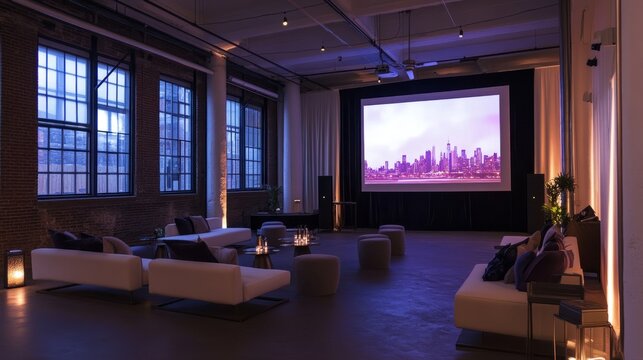 Business event space ready for a conference, featuring a large screen, sleek decor, and a welcoming atmosphere.