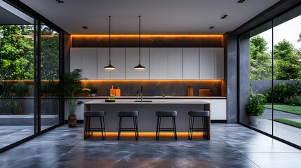 Minimalist clean kitchen interior with an agent organizing a blogging event, sleek and bright ambiance, realistic 8K resolution,