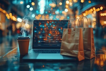Black Friday online shopping concept, featuring a laptop with open sale websites. Generative AI