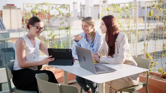 In a vibrant coworking space, three professional women collaborate in a meeting, engaging in discussions while using sleek laptops, surrounded by inspiring plants that spark creativity and innovation