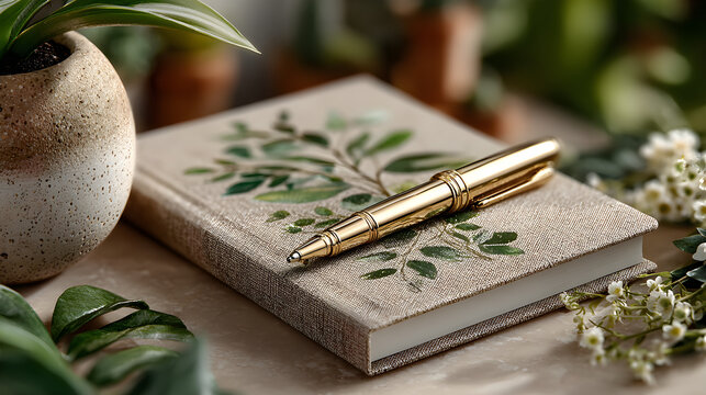 Beige notebook and sleek gold pen beautifully styled with fresh green leaves in an elegant flatlay