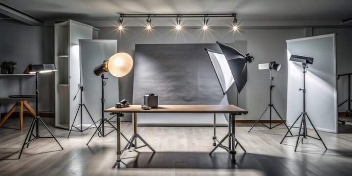 Modern photo studio with dark background, professional lighting, and sleek flooring, High-end photography environment, Generative Ai