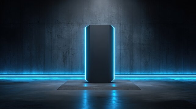 Vibrant photo of sleek black podium illuminated by a vibrant blue neon glow, designed for high-tech product displays, set against a dark, futuristic background.