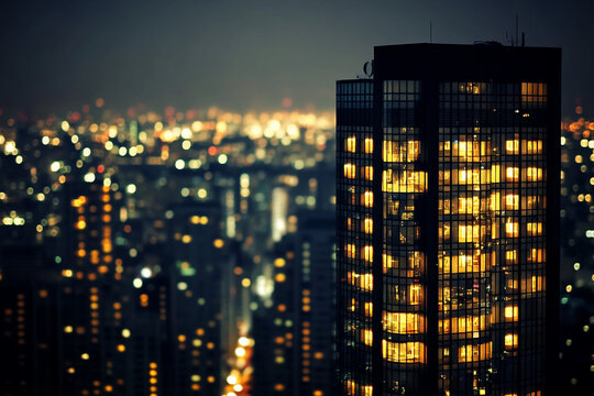 Modern office building facade at night. Illuminated windows show people working late inside cubicles. Business center exterior sleek glass architecture. Employees work diligently, computers glow.