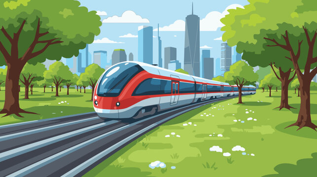 Modern train speeding through a green urban park with city skyscrapers in the background. Bright vector illustration in sleek futuristic style.