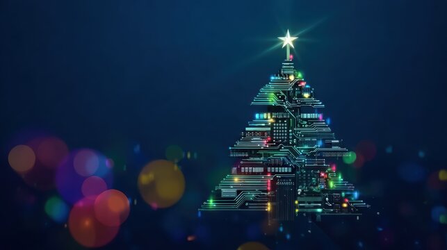 Christmas tree rendered with a sleek tech-inspired look and lights, suitable for website headers during holidays, electronics store promotions, or digital festive art.