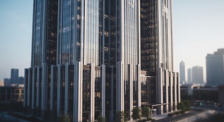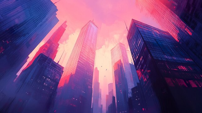Looking up at sleek skyscrapers silhouetted against a fading twilight sky, their towering forms creating a dynamic and modern cityscape