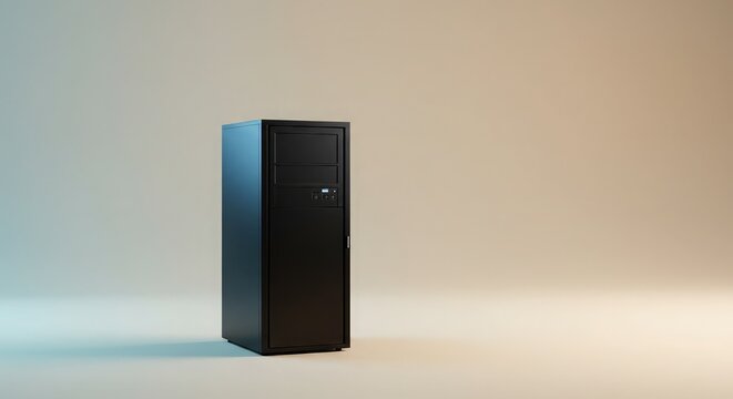 A sleek black rectangular server tower or safe standing upright against a minimalist gradient background with soft lighting.