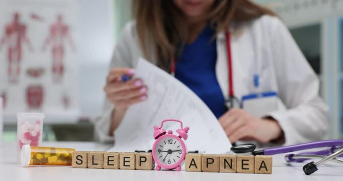 Doctor holding wooden blocks with icons sees inscription: SLEEP APNEA. Sleep Apnea Neurological Disorder Diagnosis Treatment Medical concept.