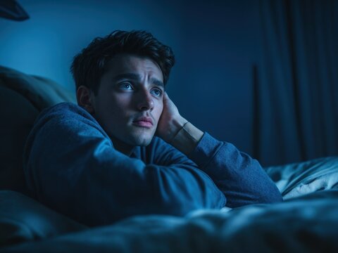 A close-up of a man s face, gasping for air while lying awake, showing signs of sleep apnea