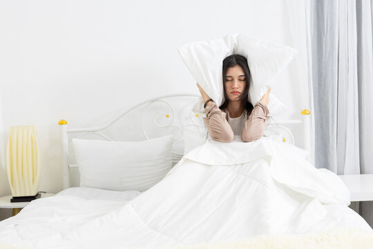 Young women covering her ears with a pillow while sitting in bed, expressing frustration, sleep disturbance, or noise problems in the bedroom, highlighting insomnia and morning irritation issues.