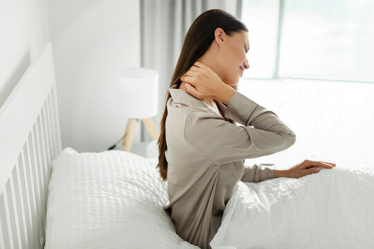 Tired young woman touching aching neck, suffering from pain after uncomfortable sleep, sitting on bed in bedroom at home, side view