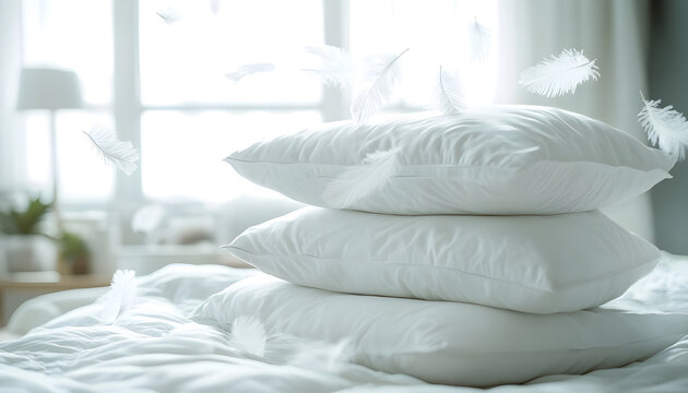 Stack of white pillows with feathers gently flying around in a bright, cozy bedroom. Promotional image for soft, comfortable pillows