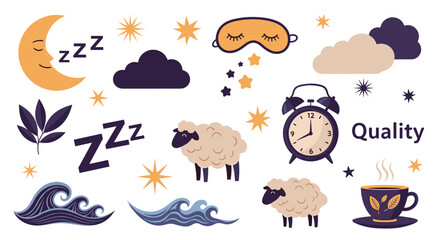 Illustration featuring sleep related elements including moon sheep clouds and alarm clock for quality sleep
