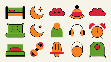 A set of line icons related to Sleep. Rest, bed, pillow, window, alarm, music, relax, and so on. Vector editable stroke.