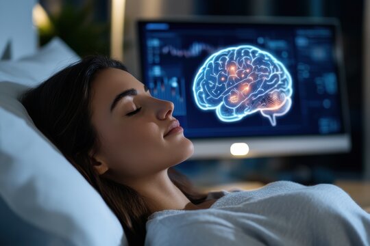 An illustration showing a woman in a restful state with a bright brain graphic behind her, portraying the connection between sleep and cognitive function.