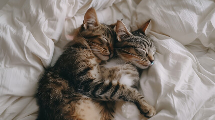 A lovely cat couple is peacefully sleeping next to each other on a white fluffy bed. One cat is hugging the other while they both rest comfortably.