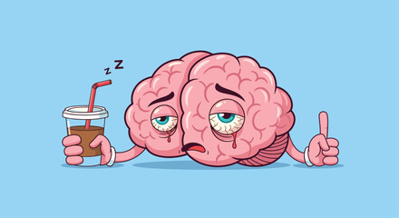 A tired cartoon brain holding a coffee cup feels sleepy and gives a thumbs up.