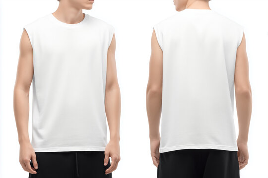 White tank top in front and back views. Isolated sleeveless male sport shirt.