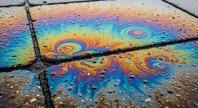 Abstract swirling oil slick texture with iridescent rainbow sheen on dark background,  oil spill,  chemistry