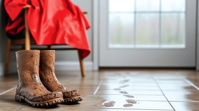 Close-up of mud-caked work boots by entryway, trail of wet footprints across tile floor, red waterproof slicker draped over chair, cozy cabin interior, soft window light