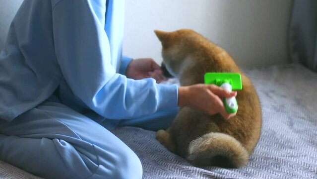 person combing and brushing with slicker brush out shiba inu puppy lying calmly in her arms at home. giving a yummy treat of dog, pet and owner. grooming siba doggy fluff with special brush