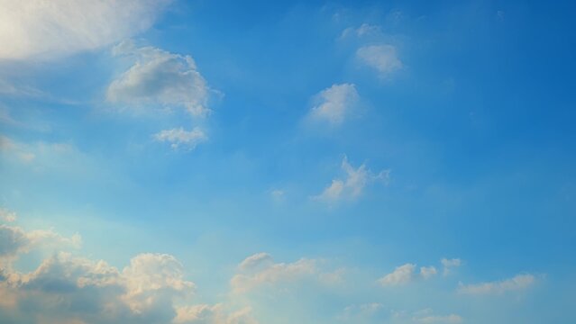 A bright blue sky with a few scattered white clouds. Some clouds have a slight golden tint from the sun, creating a warm and peaceful atmosphere. Blue sky background.