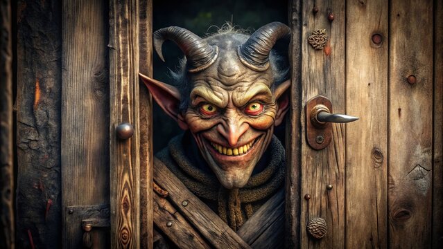 A mischievous, horned creature with wicked eyes and a sly grin lurks in the shadows, peeking around a slightly ajar, old, wooden door.