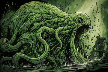 A digital drawing of a slimy green monster in a comic book or a graphic novel art style.