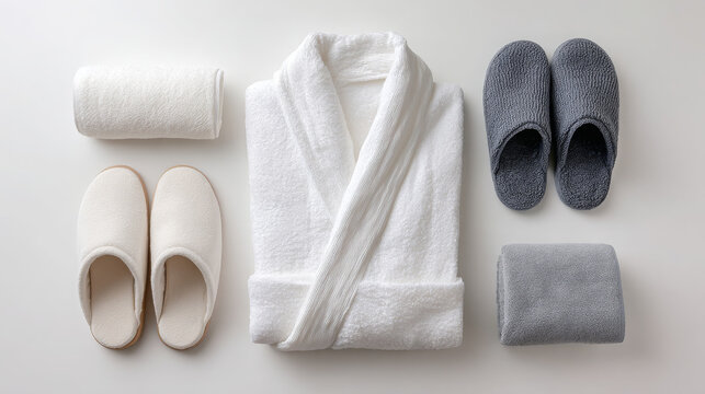 Top-down image of a clean bathrobe, towel, and slippers arranged neatly on a white surface