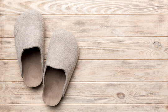 Warm winter women woolen slippers on the floor. Copy space for text